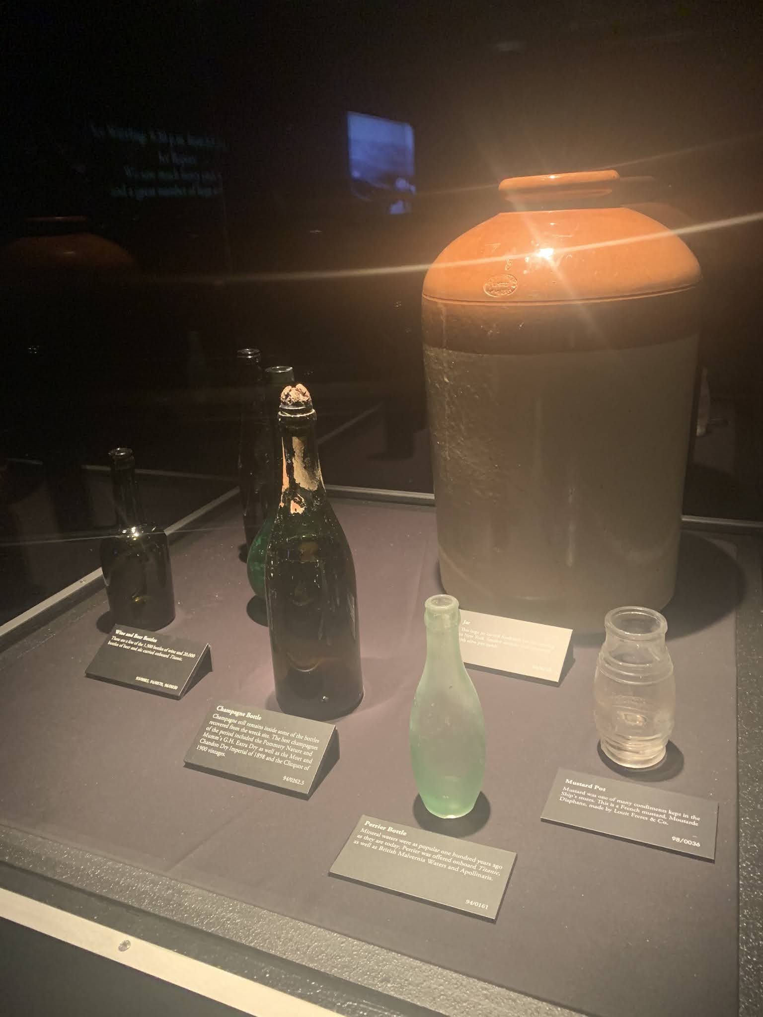 There is still champagne in that bottle. It survived a shipwreck and being on the bottom of the ocean now sitting in a glass case with liquid inside.